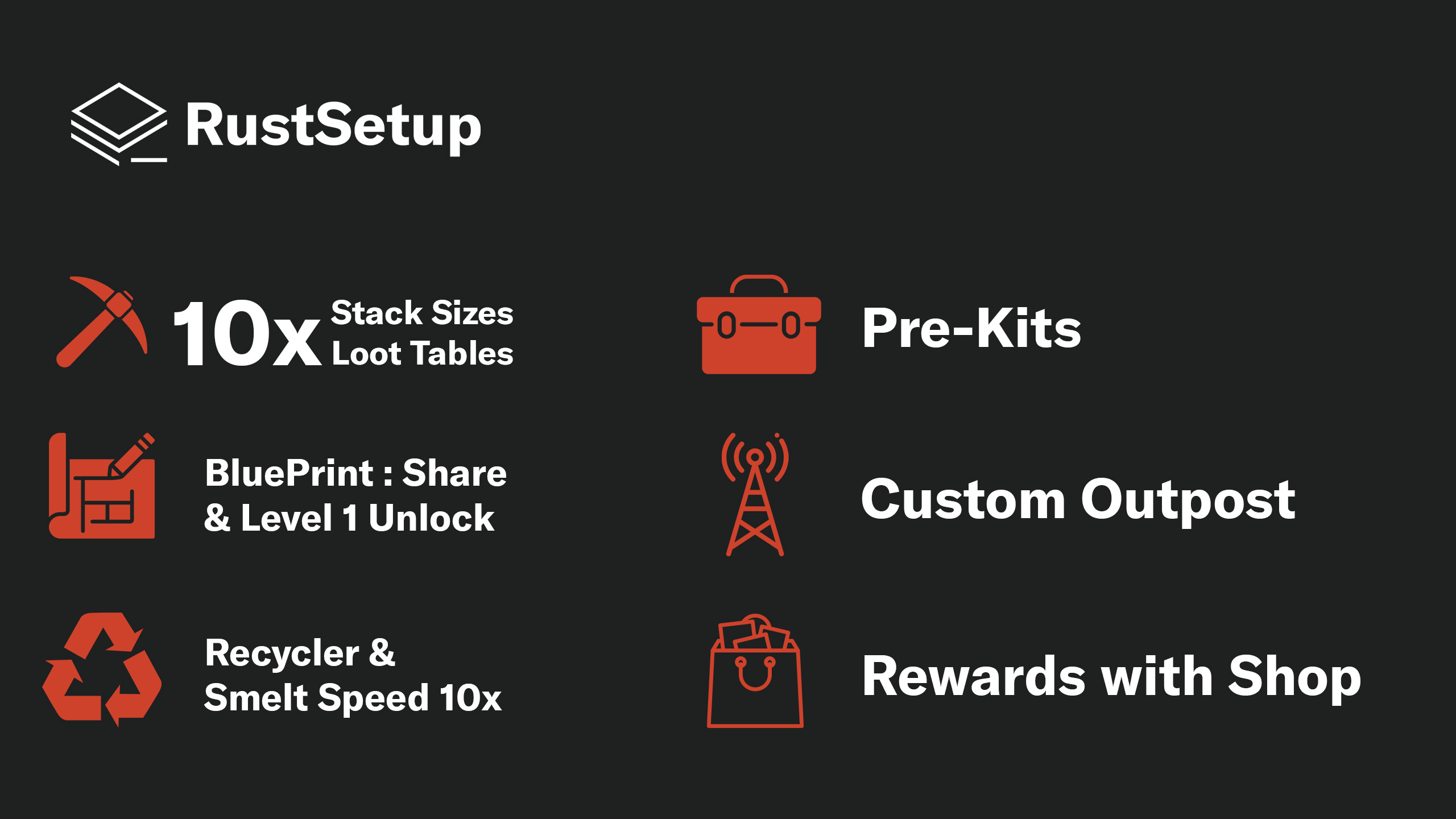 For beginners and certified amateurs alike, setting up a Rust server can quickly become time-consuming. This is why we offer you our all-in-one server setup. This includes files already pre-configured for your plugins. (Not all plugins in the list have a pre-configured file, as some do not need one). With this, your server will be ready in 10 minutes.